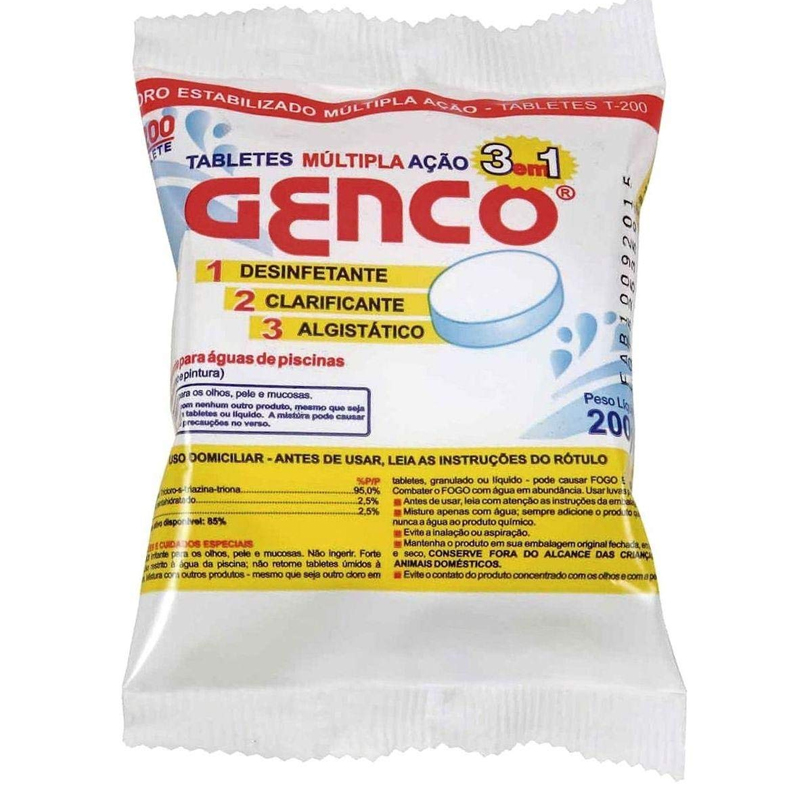 O Cloro Tablete/Pastilha Múltipla Ação 3x1 Genco 200g (T-200) é um desinfetante concentrado com 85% de cloro ativo, ideal para a cloração contínua e automática de piscinas. Ele combina desinfecção, clarificação e ação algicida/algistática em uma única pastilha de dissolução lenta, resistindo aos raios UV e facilitando a manutenção de piscinas cristalinas.